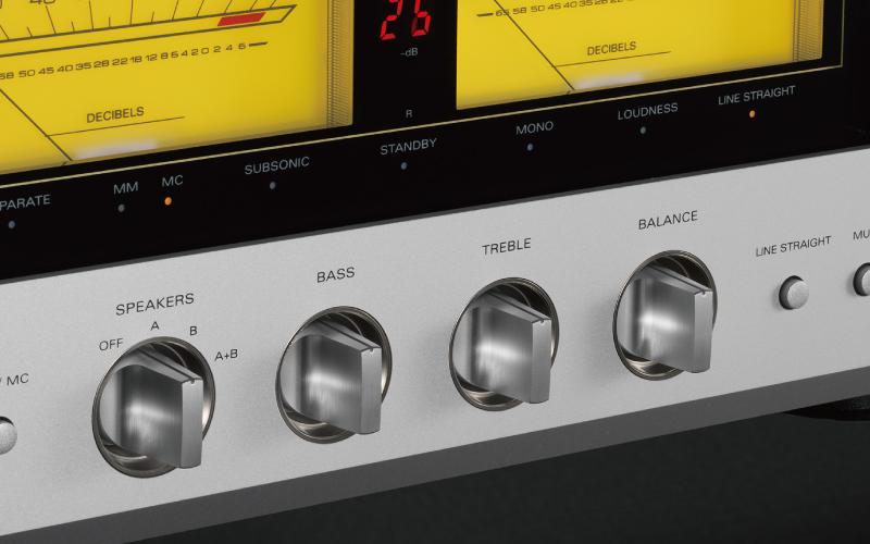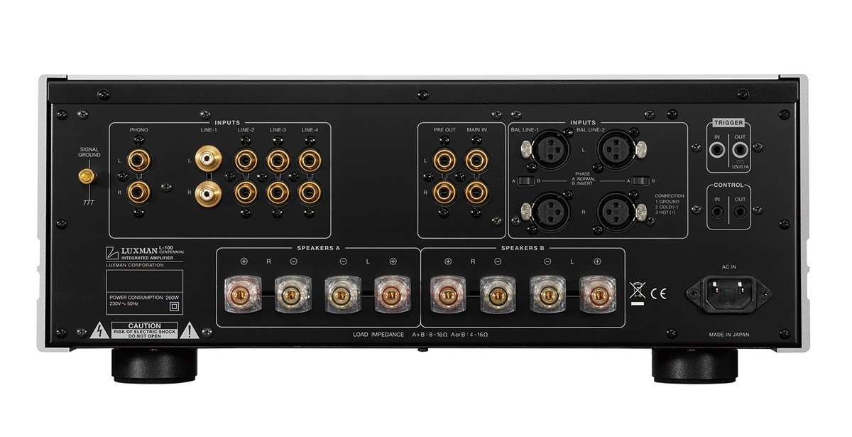 Auch abseits der reinen Verstärkersektion zeigt der L-100 CENTENNIAL, dass er als besonderes Modell gedacht ist. Ein MM/MC-Phonoeingang, symmetrischer Eingang, Main-In, Pre-Out, Klangregelung, Loudness, Balance-Regelung und die Trennbarkeit von Vor- und Endverstärker machen ihn außergewöhnlich vielseitig. Dazu kommen zwei Kopfhörerausgänge in 6,3 mm und 4,4 mm, massive Lautsprecherterminals für Bi-Wiring, hochwertige RCA-Anschlüsse mit großzügigem Abstand, ein loop-less Chassis, Peel-Coat-Platinen, rauscharme Relais sowie Isolatorfüße aus Gusseisen.