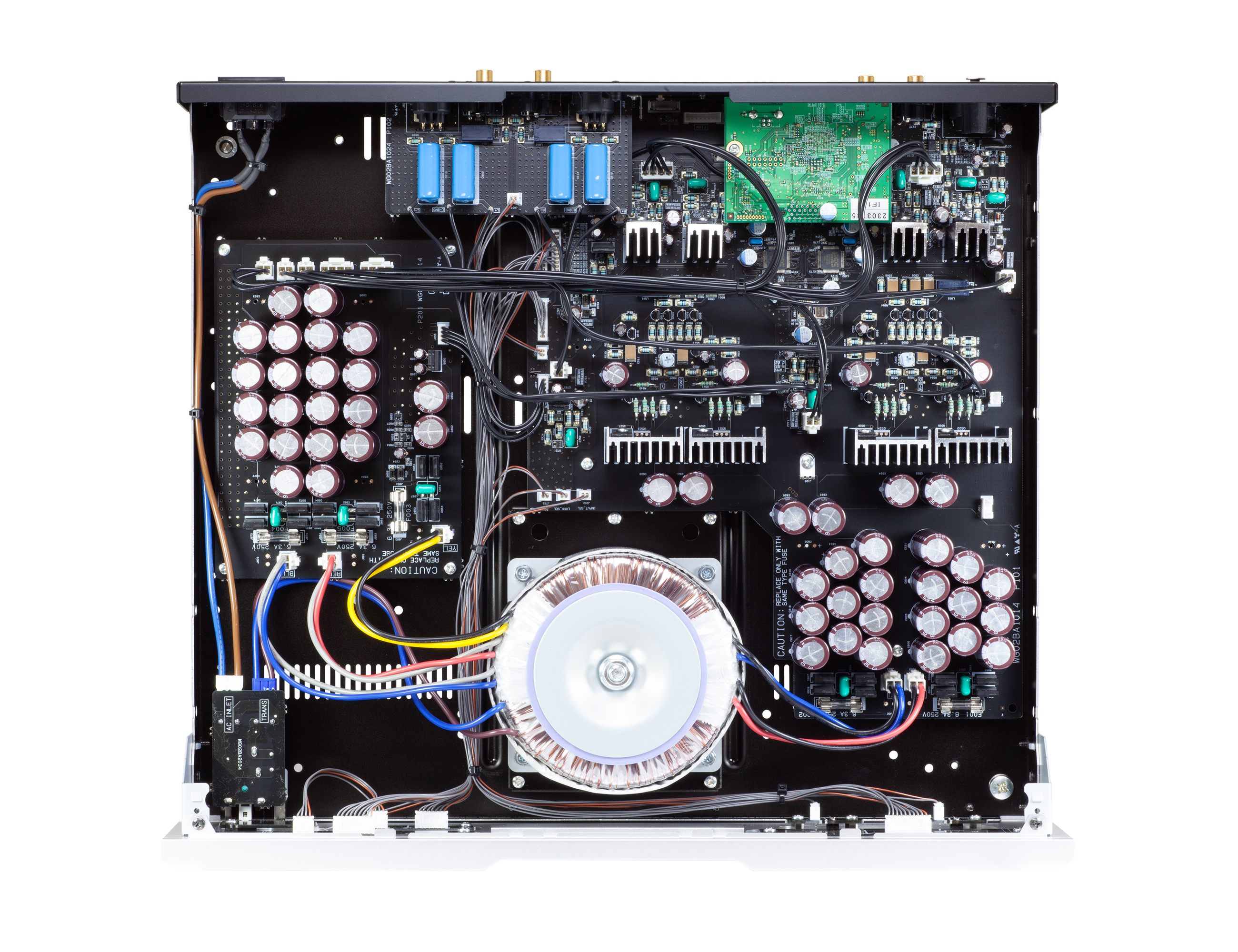 Ein großer, nicht imprägnierter 260-VA-Ringkerntransformator und eine Versorgung in „Verstärker-Größenordnung“ bilden das Fundament. Insgesamt acht getrennte Netzteile versorgen u. a. analoge und digitale DAC-Bereiche (jeweils links/rechts) sowie Quarz, USB, Logik und den S/PDIF-Differentialempfänger – jeweils über diskrete High-Speed-Regler ohne Gegenkopplung. Mechanisch sorgt eine direkte Erdung und die kontrollierte Ableitung von Transformatorvibrationen über eine dreipunktige Abstützung für weniger Resonanzen und ein ruhigeres, sauber konturiertes Klangbild.