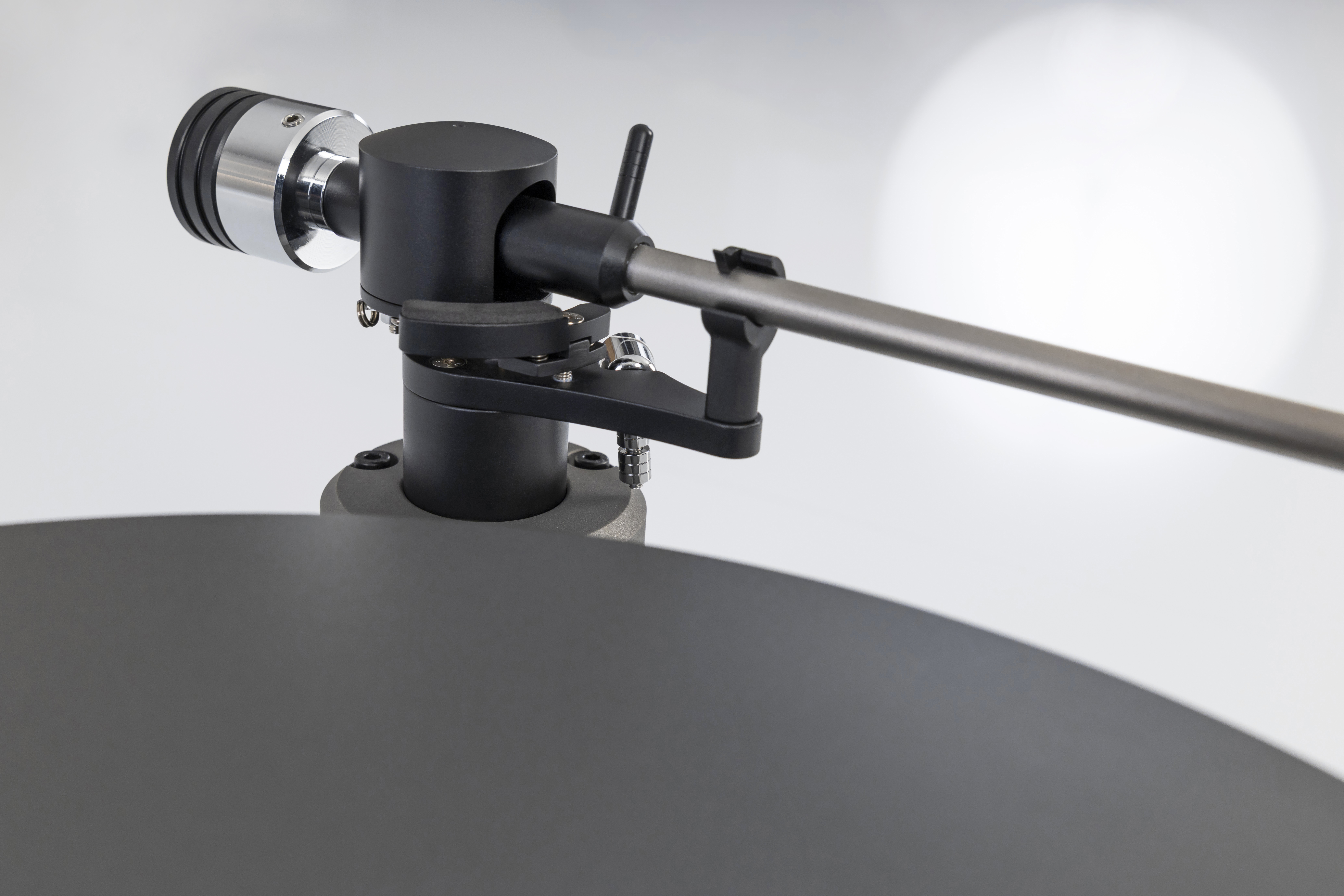 Der 60 mm starke POM-Composite-Plattenteller mit 298 mm Durchmesser und 6,2 kg Gewicht bietet eine ideale Grundlage für präzisen Gleichlauf. Das invertierte Lager kombiniert Edelstahlachse, Bronze-Kupplung, Keramikelemente und Teflon-Thrustplate, unterstützt von einer Silikonring-Suspension, um Reibung zu minimieren und maximale Stabilität zu gewährleisten.